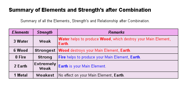5. These elements are looked at in relation to the day of birth pillar. For example, if the day pillar has earth element. The free report by default only provides the birth element and default the strength to weak.